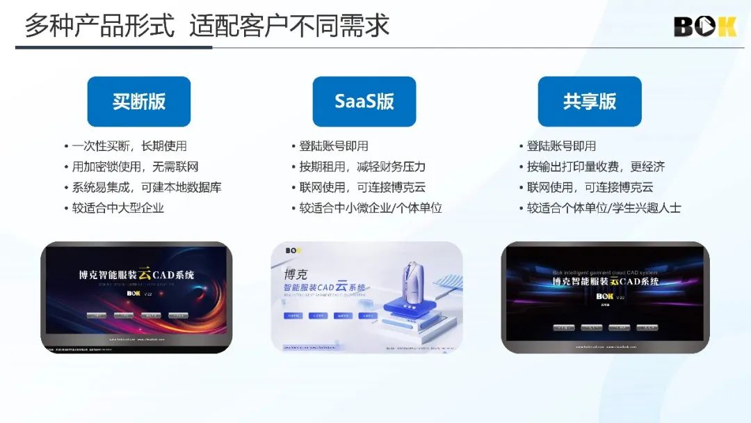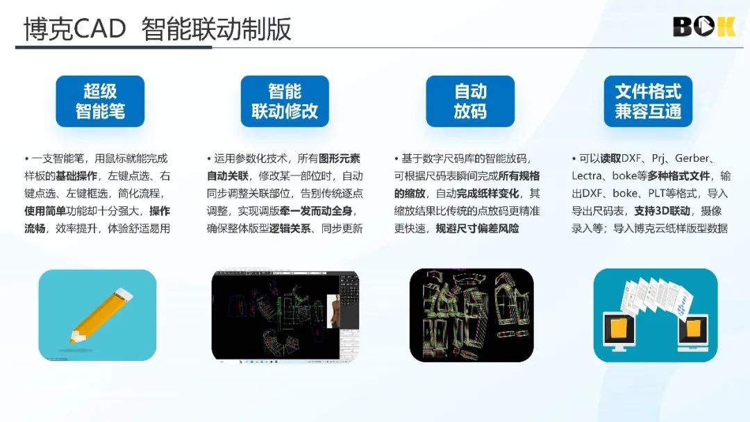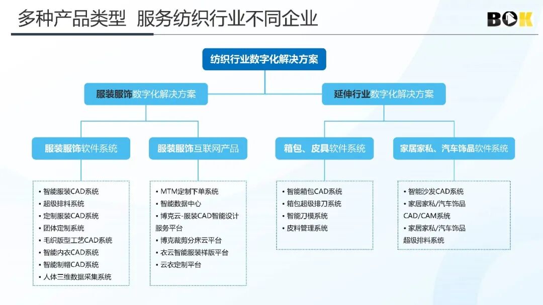 该公司目前拥有完全自主知识产权80多项,包括:56项软件著作权、2项发明专利等。产品包括博克智能服装CAD系统、博克超级排料系统、博克智能定制服装CAD系统、博克MTM系统、博克智能数据中心、博克智能箱包CAD系统、博克云平台等。经过十多年的服装行业深入研究和推广服务,建立了广泛的行业客户资源,服务于海内外3万多家企业用户,凭借领先的产品和优质的服务,得到了广大客户的一致认可与赞誉。