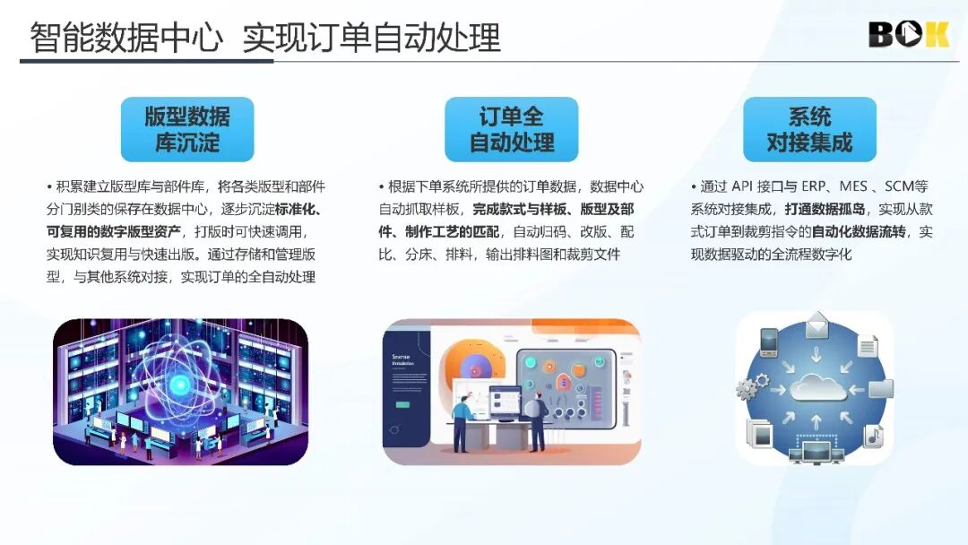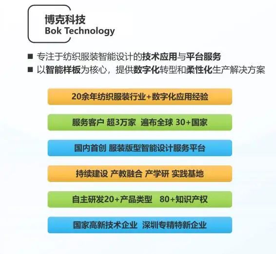 深圳市博克时代科技开发有限公司成立于2003年,是经过国家相关部门认定的国家高新技术企业及深圳双软企业。公司专注于服装数字化解决方案与互联网平台研发与推广,为行业客户提供以智能样板为核心的数字化整体解决方案。通过系统集成,打通上下游数据,实现服装生产的定制化、柔性化和智能化。