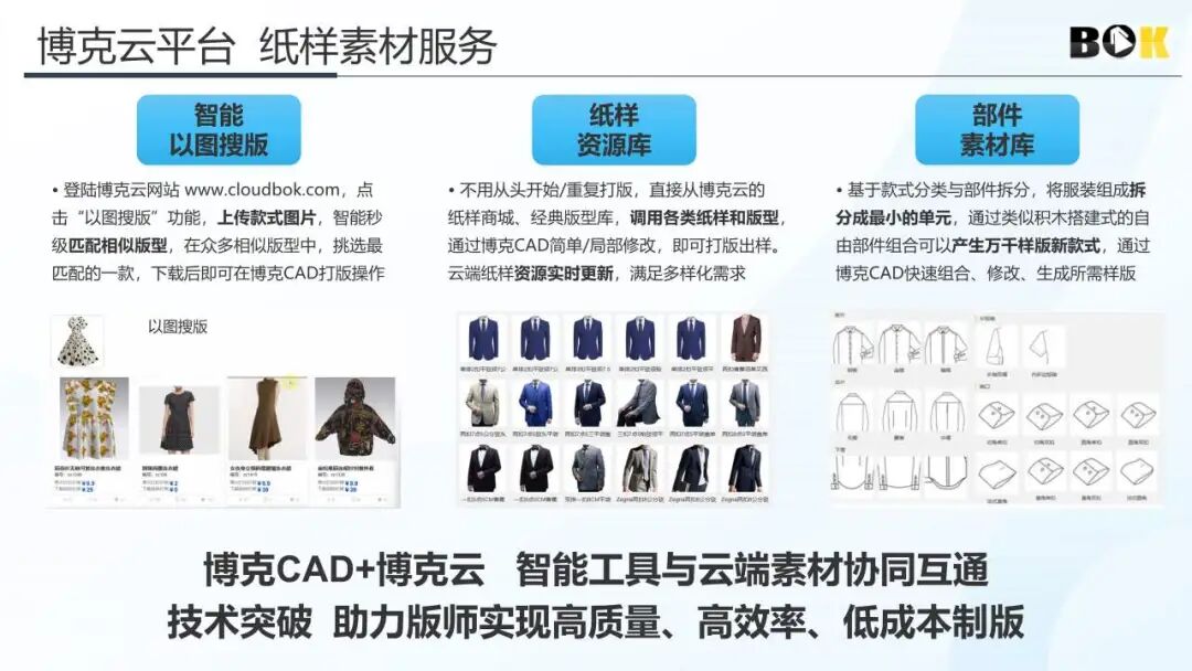 提供纸样素材服务,含 “以图搜版”(上传图片秒级匹配相似版型)、纸样商城与经典版型库(可直接调用修改)、部件组合(拆分服装单元自由组合生成新款式)功能,与博克 CAD 协同互通。