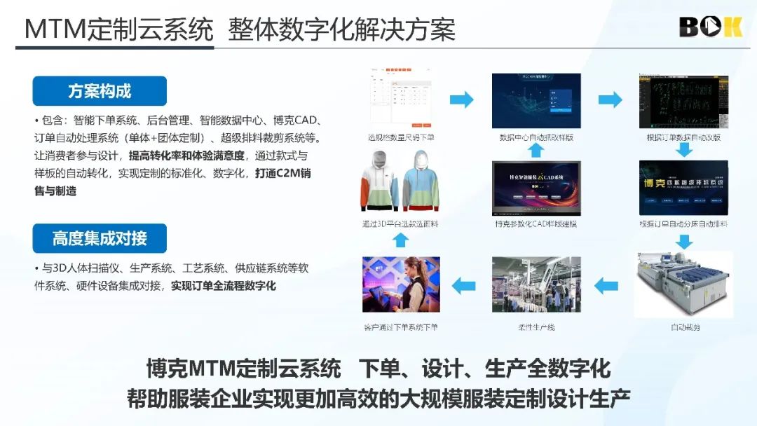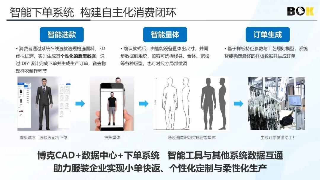消费者可在线选款、选规格面料、3D 虚拟试穿、DIY 设计,智能设备量体并同步数据,系统生成生产订单,构建自主化消费闭环,与博克 CAD、数据中心数据互通,助力小单快返等。