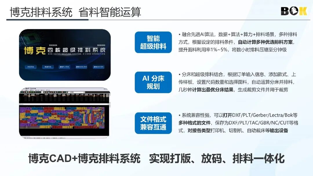 融合 AI 算法,提供多种排料方式,提升面料利用率 1%-5%,缩短排料时间;可与分床结合实现自动运算分床排料,兼容性强,能对接多种输出设备,与博克 CAD 实现打版、放码、排料一体化。