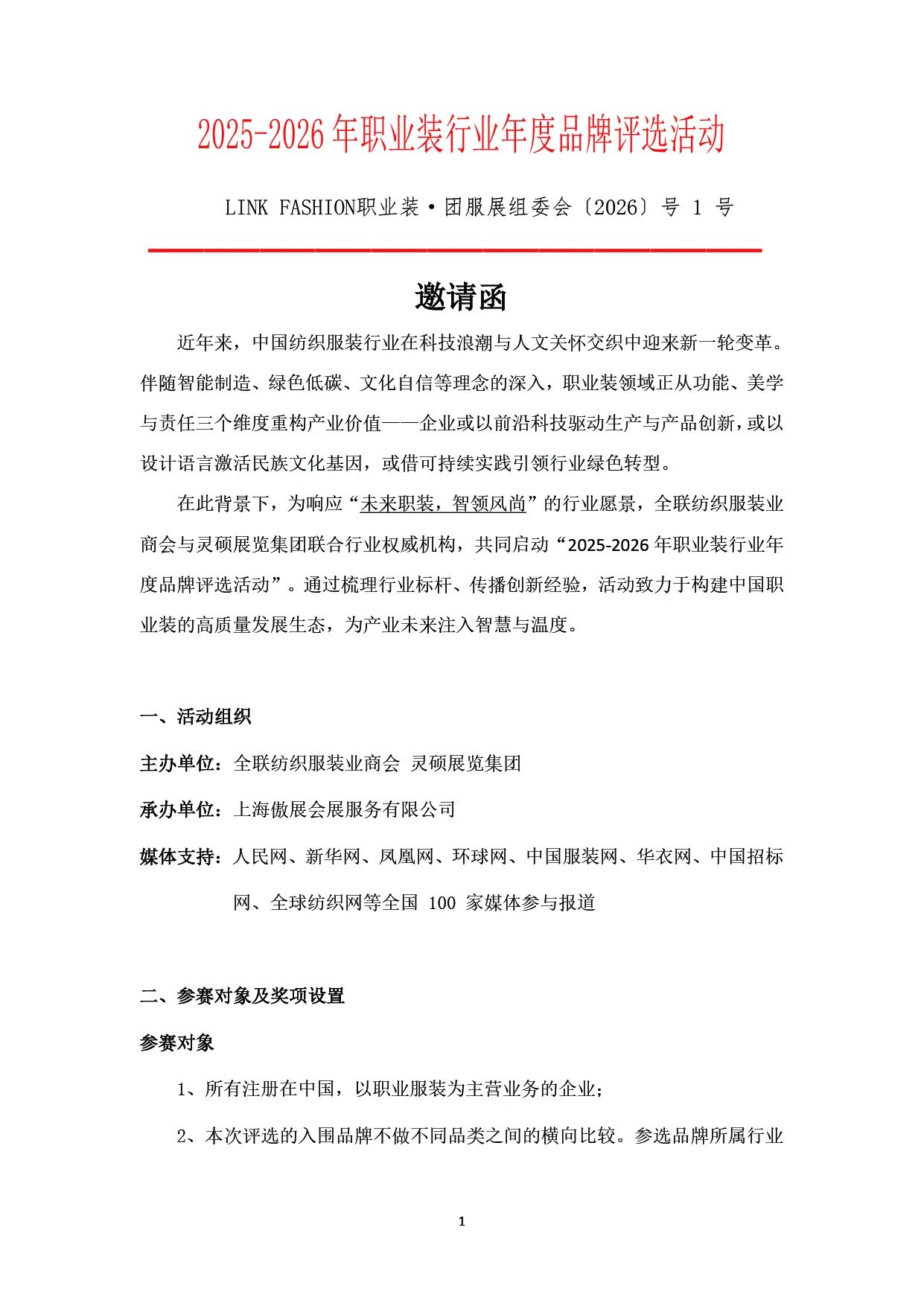 近年来,中国纺织服装行业在科技浪潮与人文关怀交织中迎来新一轮变革。伴随智能制造、绿色低碳、文化自信等理念的深入,职业装领域正从功能、美学与责任三个维度重构产业价值——企业或以前沿科技驱动生产与产品创新,或以设计语言激活民族文化基因,或借可持续实践引领行业绿色转型。在此背景下,为响应“未来职装,智领风尚”的行业愿景,全联纺织服装业商会与灵硕展览集团联合行业权威机构,共同启动“2025-2026年职业装行业年度品牌评选活动”。通过梳理行业标杆、传播创新经验,活动致力于构建中国职业装的高质量发展生态,为产业未来注入智慧与温度。